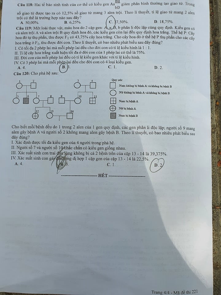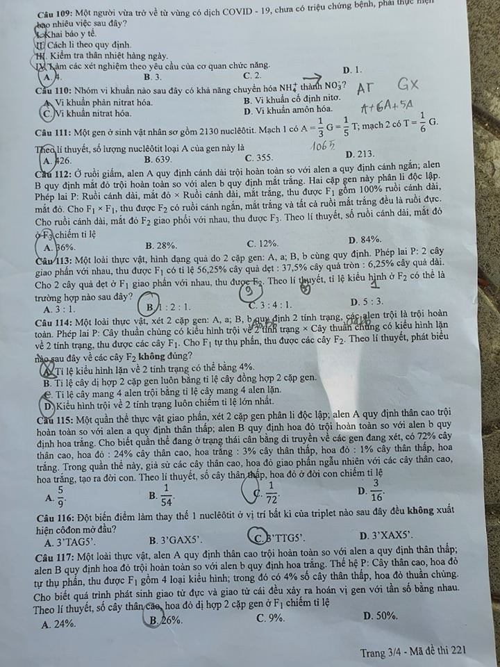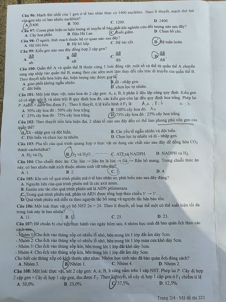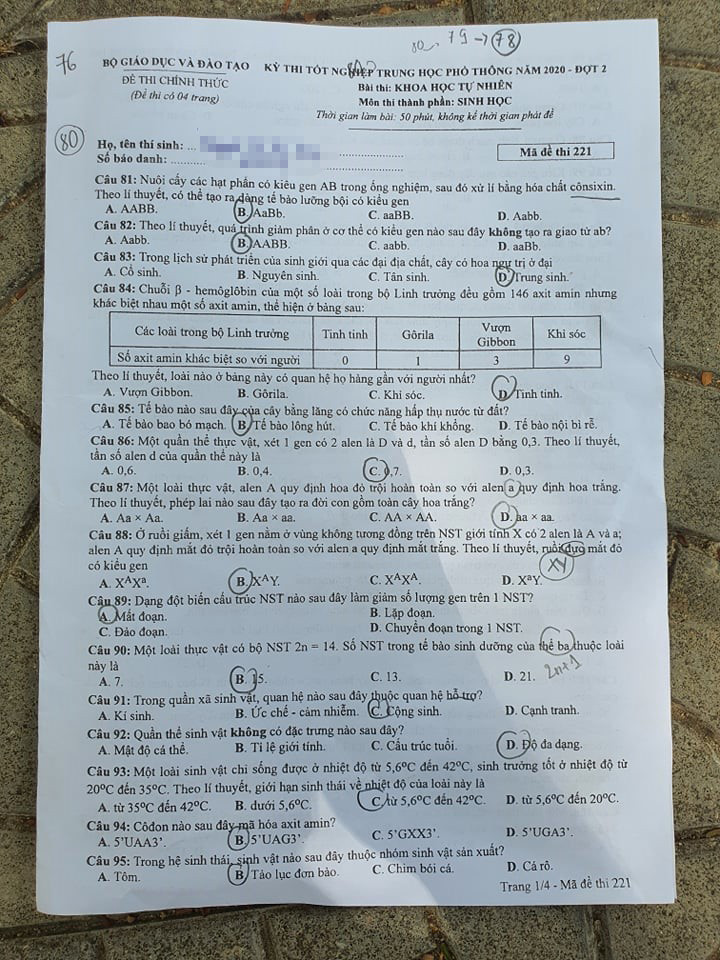 Cập nhật đề thi Sinh học tốt nghiệp THPT 2020 đợt 2, mã đề 221.