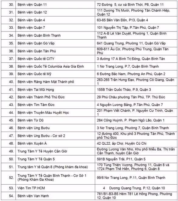 Cùng ngày, Sở Y tế TP.HCM cập nhật danh sách các bệnh viện, trung tâm y tế đủ điều kiện xét nghiệm cho người dân khi có nhu cầu ra khỏi thành phố. Hiện tại, thành phố đã có 54 cơ sở y tế xét nghiệm nhanh kháng nguyên và 26 cơ sở xét nghiệm RT-PCR.