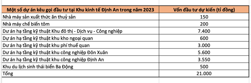 UBND tỉnh Trà Vinh vừa công bố danh mục 44 dự án kêu gọi đầu tư năm 2023, trong đó có tới 11 dự án tại Khu Kinh tế Định An.