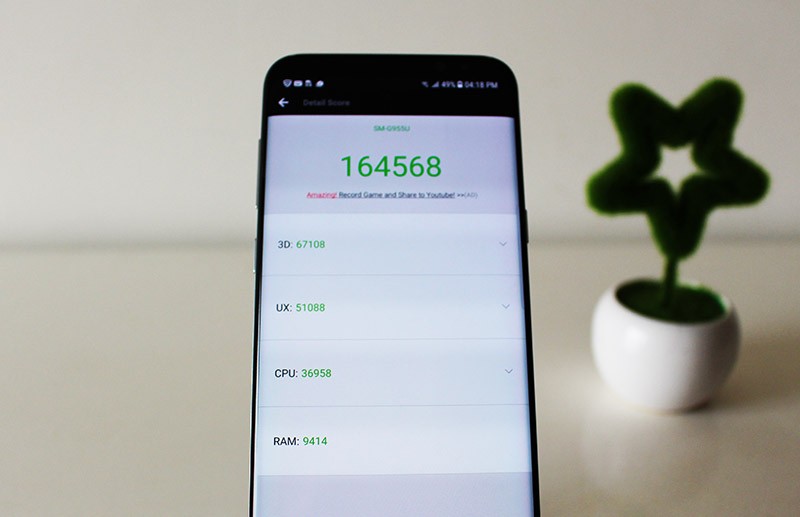 Test sức mạnh của Galaxy S8 Plus với AnTuTu Benchmark, Galaxy S8 cho số điểm 164.568, một con số ấn tượng.