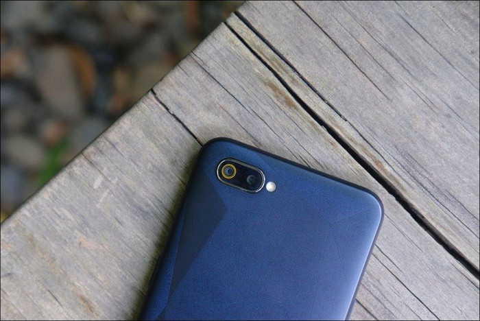 Mặt lưng nhựa của máy cho cảm giác cầm ôm tay với phần viền được bo cong kết hợp họa tiết kim cương thú vị – chi tiết mà nó kế thừa từ đàn anh Realme 2. Ngoại trừ cụm camera nổi lên ở góc trái trên thì phần còn lại của lưng máy khá liền mạch vì Realme C2 không trang bị cảm biến vân tay, do đó thao tác mở khóa máy phải dựa vào khả năng nhận dạng khuôn mặt qua camera trước hoặc các hình mẫu, mã PIN quen thuộc.