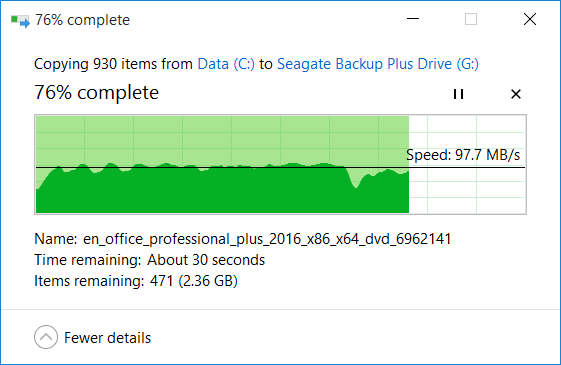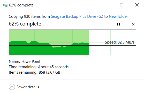 Thử nghiệm đọc-ghi với thư mục dữ liệu trong máy tính dung lượng 10GB bao gồm nhiều file hỗn hợp kích thước lớn nhỏ. Kết quả tốc độ đọc-ghi file trung bình là 82- 97 MB/s, tương đương với kết quả của chương trình HD Tune Pro. Cụ thể mất 1 phút 45 giây để cóp 10GB dữ liệu trên vào trong ổ cứng và mất 2 phút 40 giây để cóp dữ liệu 10GB từ ổ cứng vào máy tính, kết quả như vậy là khá nhưng chưa ấn tượng lắm.