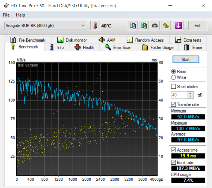 Còn chương trình HD Tune Pro thường dùng để đo tốc độ trung bình và sự ổn định trong quá trình sao lưu dữ liệu của ổ cứng thì cho kết quả ở mức cao nhất là 130,7MB/s và thấp nhất là 52MB/s, trung bình là 97,6MB/s. Thời gian truy cập ngẫu nhiên là 19,9ms. Theo đồ thị kết quả thì mẫu ổ cứng này có hiện tượng tốc độ giảm dần đều theo thời gian, nghĩa là khoảng thời gian đầu khá cao và dần dần tốc độ giảm xuống.