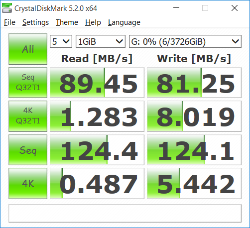Đối với phần mềm Crystal Disk Mark hiệu năng ổ cứng Seagate Backup Plus cho tốc độ đọc/ghi với 1GB dữ liệu ngẫu nghiên đạt mức 124 MB/s rất ấn tượng so với các ổ cứng gắn ngoài khác bởi con số bình quân ở khoảng 110/95 MB/s (đọc/ghi).