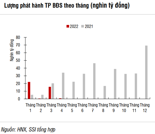 Tuy nhiên, sau việc hơn 10.000 tỉ đồng trái phiếu của nhóm Tân Hoàng Minh bị hủy bỏ, lượng TPDN do doanh nghiệp bất động sản phát hành đã giảm mạnh, chỉ ghi nhận 820 tỉ đồng trái phiếu phát hành trong tháng 4/2022, thấp hơn nhiều so với mức bình quân theo tháng trong năm 2021 là 26.000 tỉ đồng.