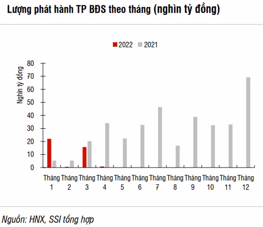 Tuy nhiên, sau việc hơn 10.000 tỉ đồng trái phiếu của nhóm Tân Hoàng Minh bị hủy bỏ, lượng TPDN do doanh nghiệp bất động sản phát hành đã giảm mạnh, chỉ ghi nhận 820 tỉ đồng trái phiếu phát hành trong tháng 4/2022, thấp hơn nhiều so với mức bình quân theo tháng trong năm 2021 là 26.000 tỉ đồng.