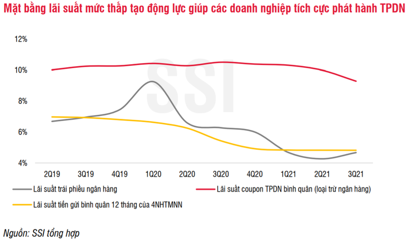 SSI cho rằng mặt bằng lãi suất ở mức thấp là động lực chính khiến các doanh nghiệp tích cực đẩy mạnh phát hành TPDN để có thể huy động vốn nhanh và giảm áp lực lên chi phí tài chính, khi mặt bằng lãi suất cho vay từ ngân hàng không có mức giảm tương ứng.