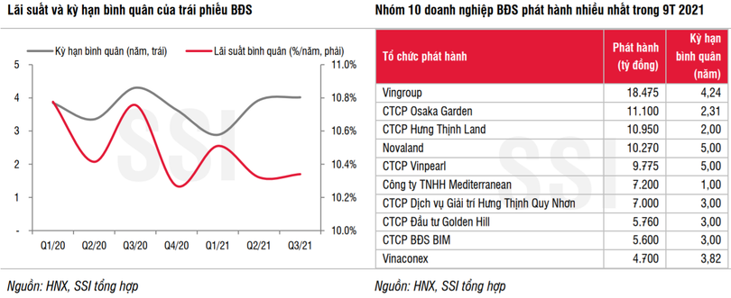 Tính chung 9 tháng đầu năm 2021, các doanh nghiệp bất động sản phát hành 201.900 tỉ đồng trái phiếu với lãi suất bình quân là 10,36%/năm, thấp hơn 30 điểm cơ bản so với bình quân năm 2020 và kỳ hạn bình quân ở mức 3,8 năm.