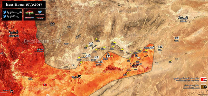 Trên hướng tấn công chính, quân đội Syria tập trung tấn công dọc theo quốc lộ Homs – Deir Ezzor phía đông thành cổ Palmyra, cố gắng đánh chiếm ngã ba giao lộ Al-Talilah và mỏ khí đốt Arak.