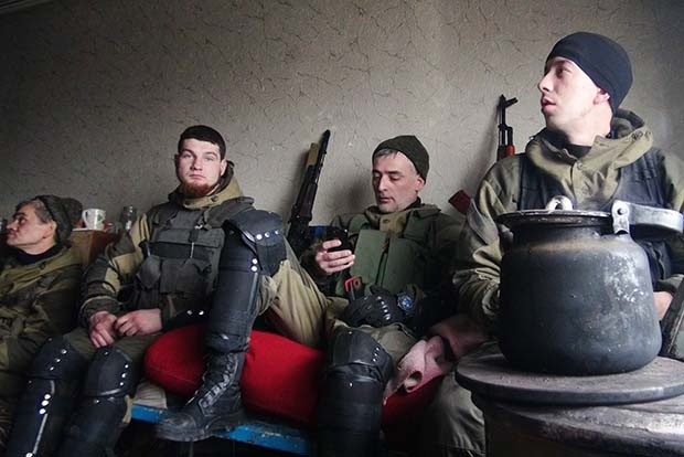 Ngày 18.01. Lực lượng dân quân Cộng hòa nhân dân Donetsk nghỉ ngơi trong một ngôi nhà gần sân bay.