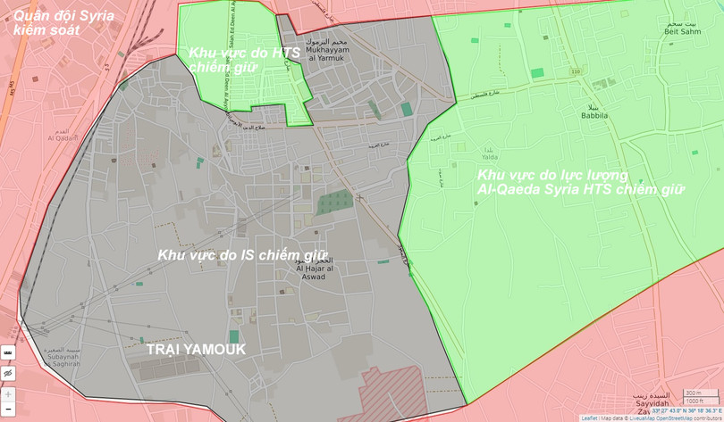 Nhóm chiến binh HTS kiểm soát khoảng 10% diện tích Trại Yarmouk đồng thời kiểm soát các quận lân cận Beit Saem, Yalda và Babila.