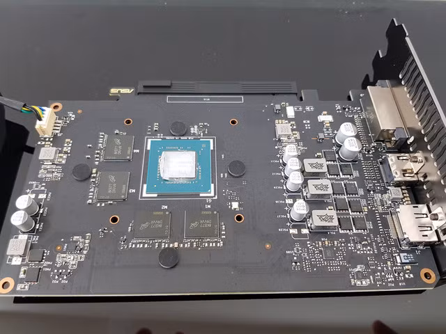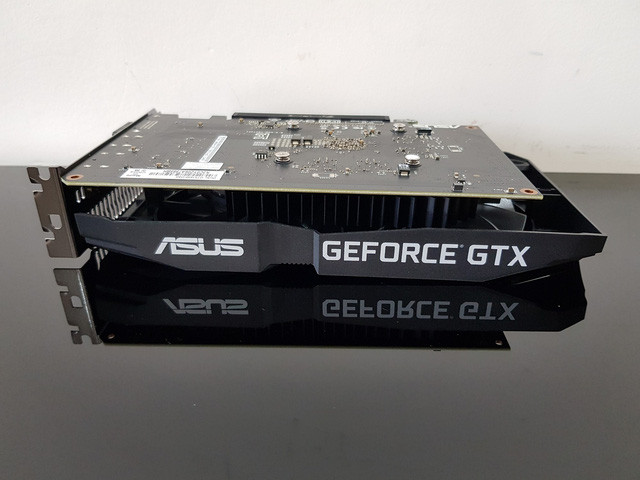 Bo mạch màu đen của GTX 1650 Dual rất hợp tone với mặt trước tuy nhiên lại không được che chắn bởi bất cứ lớp backplate nào, phải chi Asus hào phóng một chút che lớp mạch này lại với một tấm backplate bằng bất cứ vật liệu gì đi nữa thì chiếc card này sẽ hoàn hảo hơn.