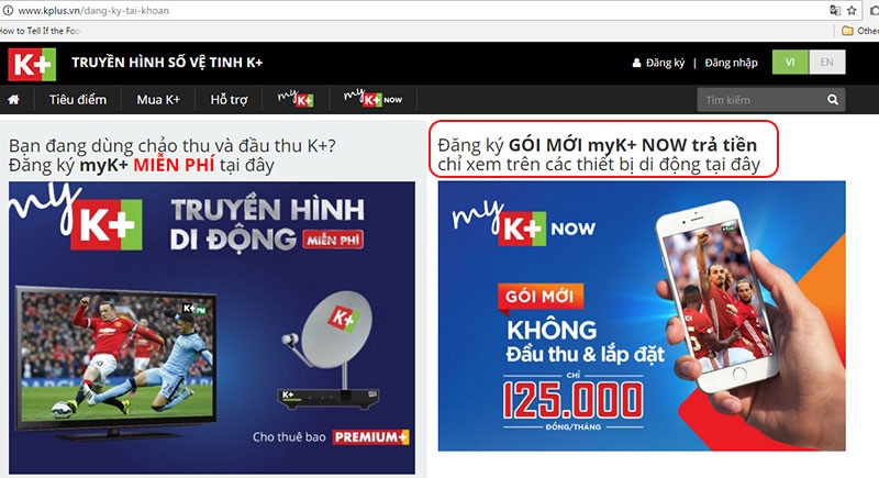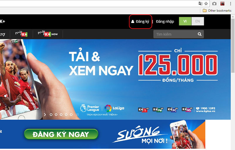 Vào trang chủ kplus.vn, chọn nút "Đăng ký"