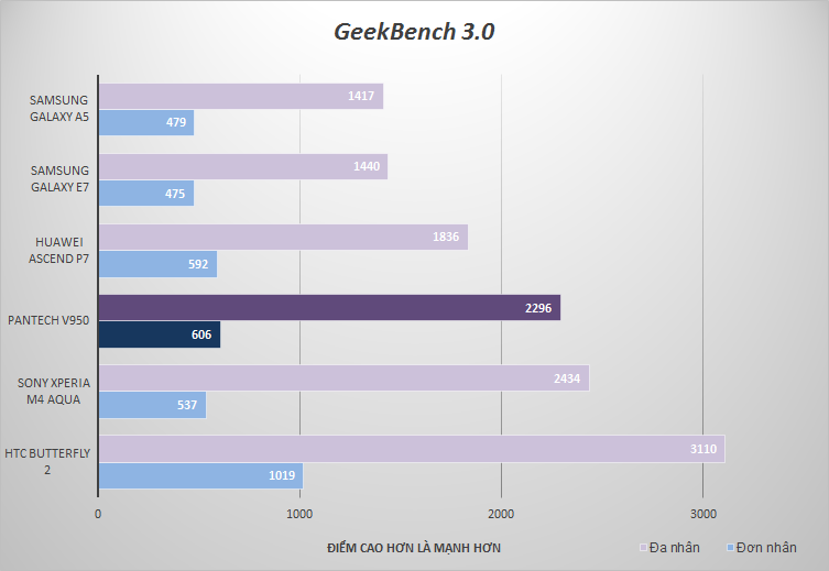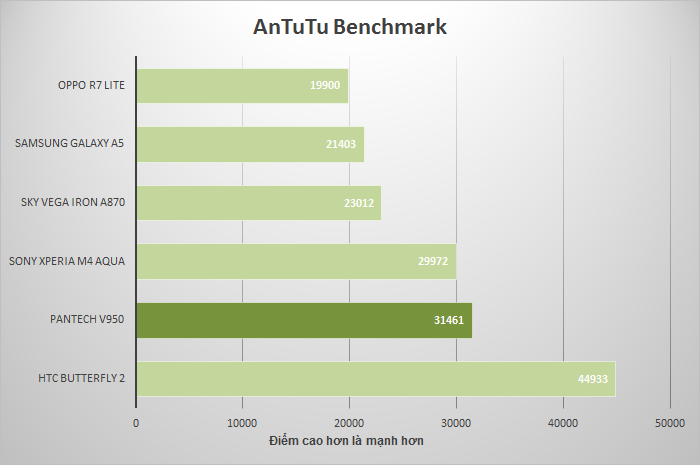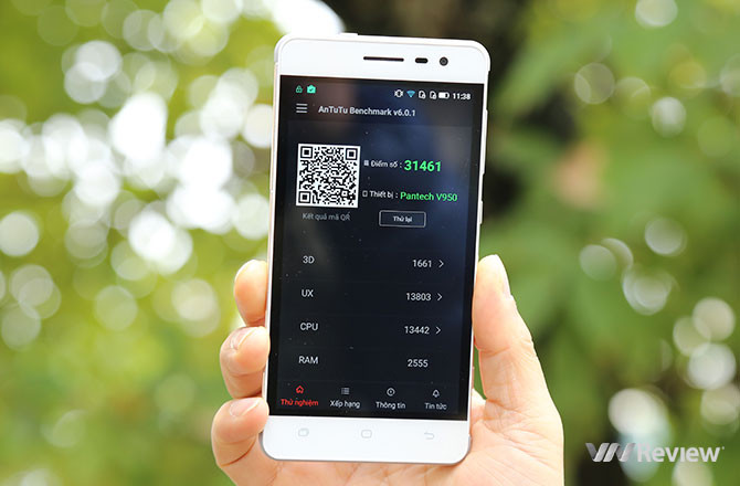 Về hiệu năng, trong thời gian trải nghiệm, chúng tôi thấy vi xử lý Snapdragon 415 tám lõi tốc độ 1.4GHz và RAM 2GB giúp máy đảm nhận khá tốt việc xử lý các hoạt động trên điện thoại. Ngoài các chức năng cơ bản như gọi điện, nhắn tin, lướt web hay các tác vụ trên giao diện, máy cũng chơi trơn tru tựa game Asphalt 8 tương đối nặng ở thiết lập đồ hoạ mặc định (trung bình). Trên các phần mềm đo hiệu năng, Pantech V950 đạt điểm tương đương các smartphone tầm trung với tầm giá 5-7 triệu đồng hiện nay.