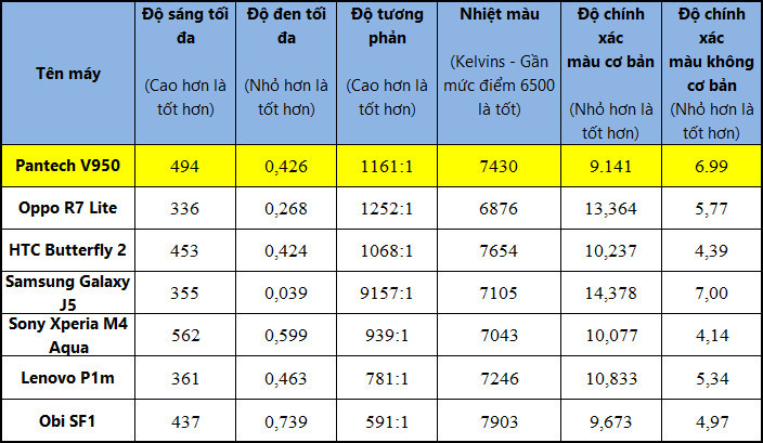 Bảng kết quả đo màn hình của máy so với một số sản phẩm cùng tầm giá
