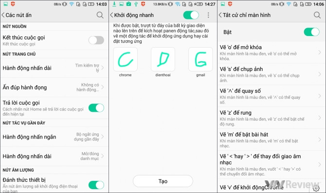Trong giao diện cài đặt, điện thoại này cũng được nhà sản xuất bổ sung khá nhiều thao tác điều khiển bằng cử chỉ như chạm đúp lên màn hình để mở màn hình, đặt máy lên tai nghe ngay cuộc gọi đến, úp máy để tắt chuông hay vẽ ký tự để mở ứng dụng kể cả khi màn hình tắt hay bật (chẳng hạn vẽ chữ c để mở camera, chữ m để mở nhạc…)