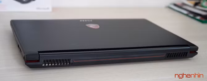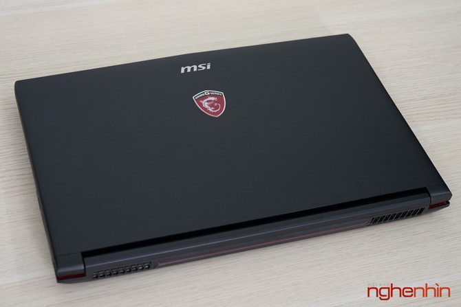 Cảm nhận đầu tiên về MSI GP62 7RD là máy khá dày và to, có vẻ MSI đã làm phần đế cao thêm để tạo không gian sắp xếp ống đồng tản nhiệt và giúp hệ thống quạt Cooler Boost hoạt động hiệu quả hơn. Vỏ laptop ở mặt ngoài và chiếu kê tay làm bằng nhôm hàng không, tuy đã được sơn nhám chống bám dấu tay nhưng bề mặt vẫn lưu lại vết mồ hôi khi sử dụng, may mắn là có thể lau sạch.