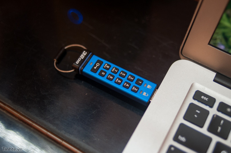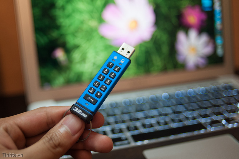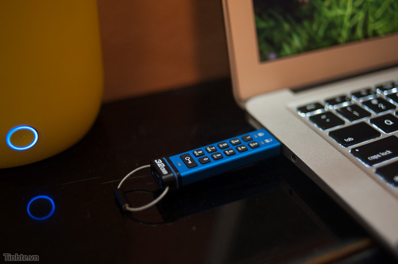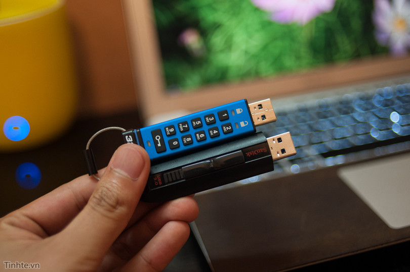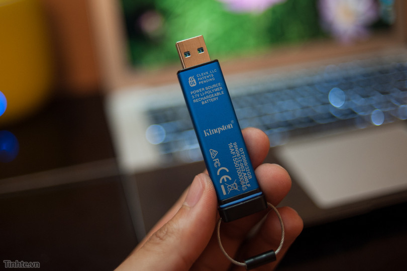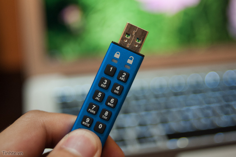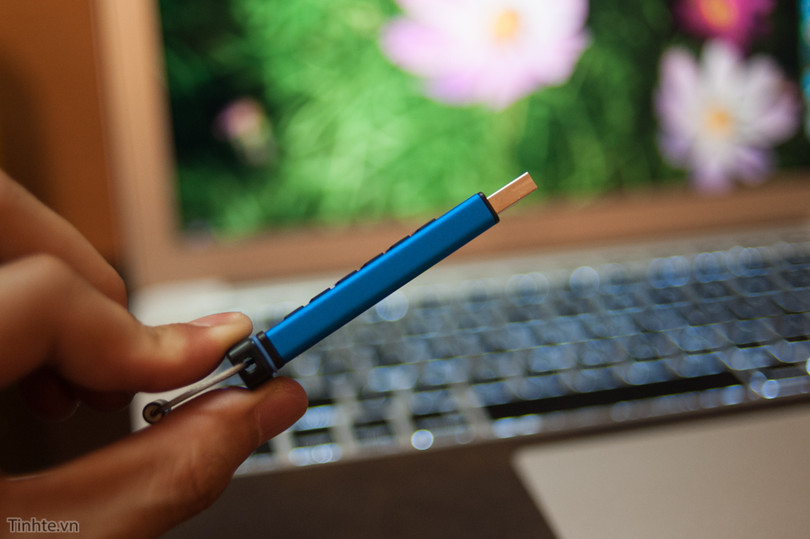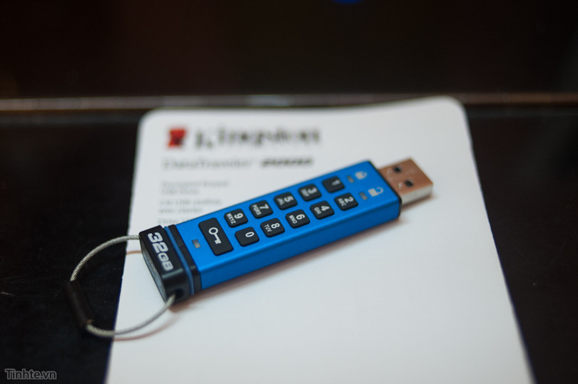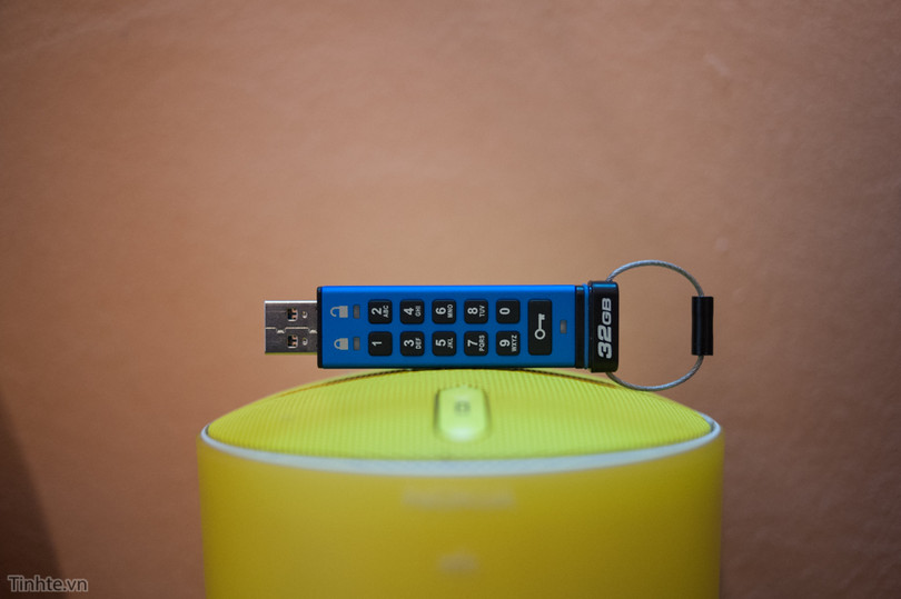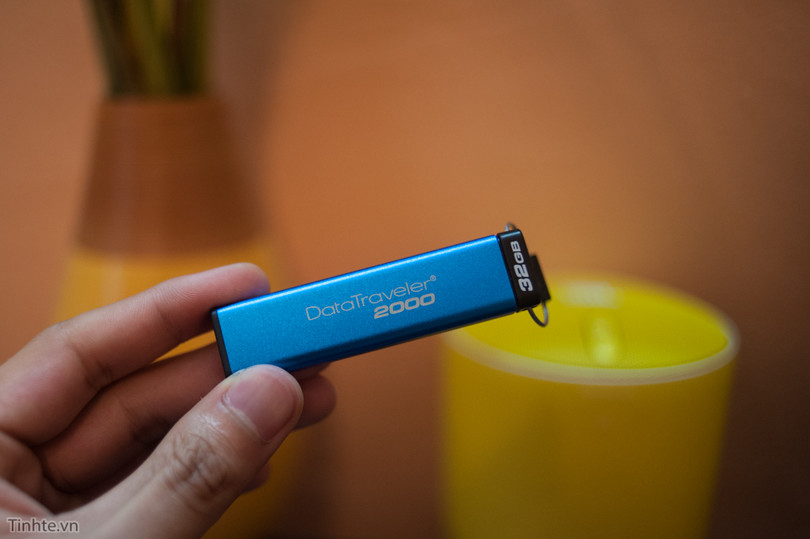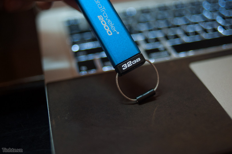 Đầu cuối của DataTraveler 2000 còn có một dây sắt hình tròn để móc vào tay hoặc chìa khóa, dĩ nhiên bạn cũng có thể bỏ cái dây này ra khỏi USB nếu không muốn. Mình có cảm giác nó rất giống với ruột phanh xe đạp, nếu là thật thì ắt hẳn sẽ rất chắc chắn. Đi kèm với USB còn là một nắp cũng làm từ nhôm để che đi phần phím số và đầu kết nối khi không sử dụng. Phần nắp này đồng thời cũng giúp chúng ta không bị bấm nhầm vào phím số khi để trong túi, bởi lỡ may bấm nhầm nhiều lần sẽ rất nguy hiểm cho dữ liệu.