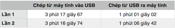 Thử chép một file hỗn hợp (gồm ảnh, nhạc, file cài đặt, văn bản...) nặng 8.46GB vào USB và chép từ USB ra máy tính qua hai lần. Thử trên MacBook Air hỗ trợ USB 3.0, ổ được định dạng (format) OS X Extended (Journaled).