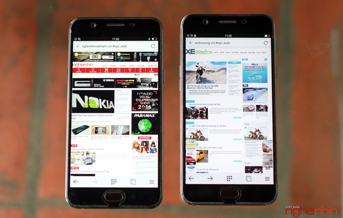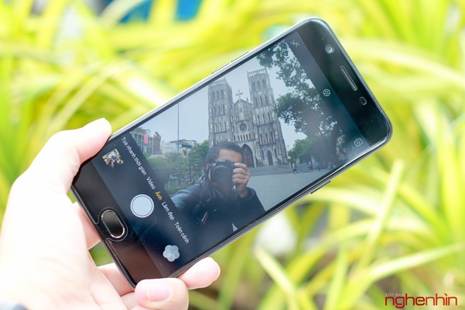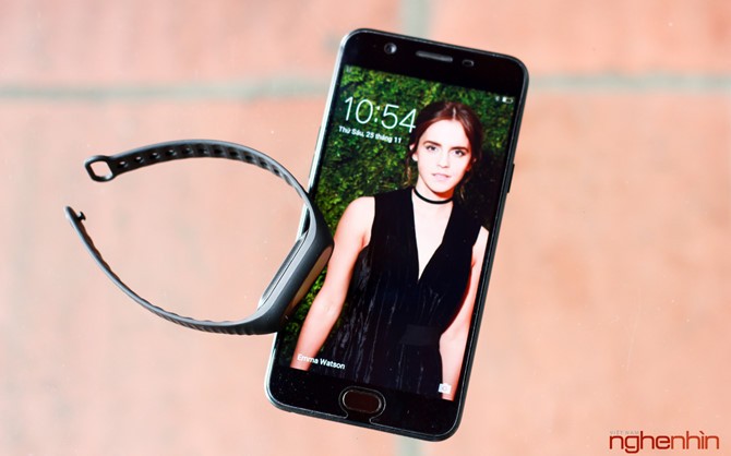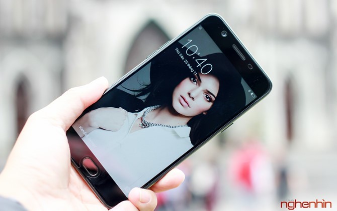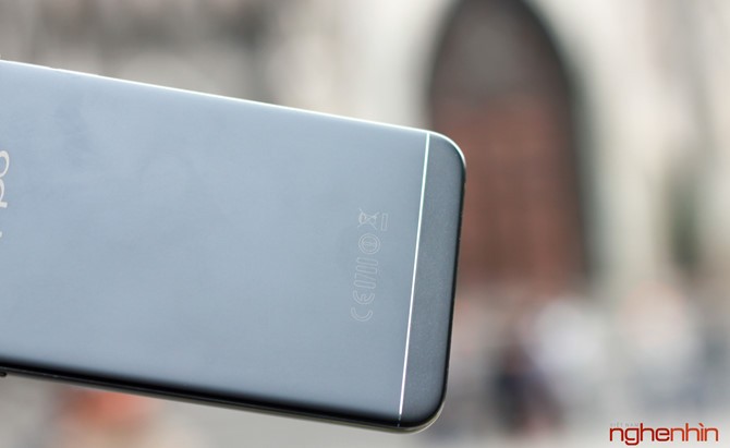 Phần trên và dưới của mặt lưng được làm nhám và phủ sơn đen hơi đậm hơn mảng giữa, Oppo F1s màu này đẹp hơn so với phiên bản xám đôi chút. Lớp vỏ đen nhám tương tự iPhone 7/7 Plus nhưng ít bám bẩn hơn.