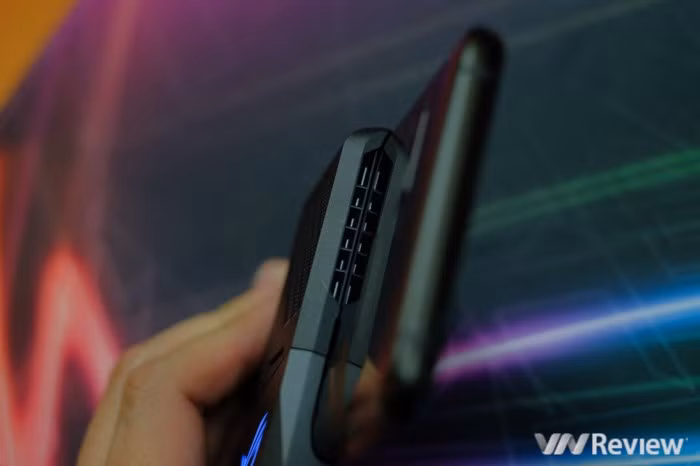 Ở hông, máy có một cổng riêng để kết nối với phụ kiện. Nhà sản xuất tặng kèm một bộ tản nhiệt để gắn vào đây, có quạt gió để đẩy khí nóng sang hai bên. Phần đáy tản nhiệt còn có cổng USB Type C, cho phép cắm sạc ngang thân máy, bớt vướng khi đang cầm chơi game. Bản thân ROG Phone cũng được trang bị cổng USB Type C hỗ trợ sạc nhanh và vẫn giữ lại cổng âm thanh 3.5mm truyền thống.