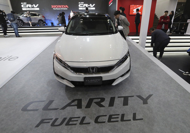 Honda đã lần đầu tiên trình làng mẫu sử dụng pin nhiên liệuClarity Fuel Celltại Hàn Quốc, với khả năng chạy được quãng đường tương đương các xe sử dụng động cơ xăng. Honda Clarity Fuel Cell có thể chạy hơn 480 km, với mỗi bình hydrogen có khả năng sạc đầy điện cho xe chỉ trong 3 phút. (Ảnh: AP)