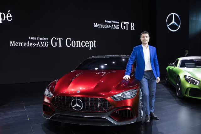 CEO Dimitris Psillakis của Mercedes-Benz Hàn Quốc bên chiếcMercedes-AMG GT conceptmà ông giới thiệu là có khả năng tăng tốc 0-100 km/h chỉ trong 3 giây, nhờ động cơ hơn 800 mã lực. Ngoài ra, hãng xe sang Đức còn mang tới tới Triển lãm ô tô Seoul các mẫu xe hybrid C 350 e và GLC 350 e 4Matic. (Ảnh: Yonhap)