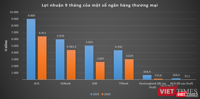 Với Kienlongbank, nhà băng này ghi nhận lợi nhuận sau thuế 9 tháng đầu năm đạt 664,4 tỉ đồng, gấp 6 cùng kỳ năm trước. Trong 9 tháng đầu năm, thu nhập lãi thuần của Kienlongbank tăng hơn 90% so với cùng kỳ, đạt 1.517,5 tỉ đồng.