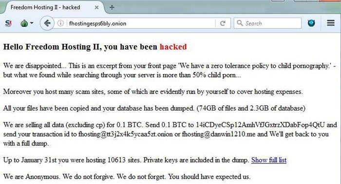 Năm 2017, Freedom Hosting II, dịch vụ lưu trữ hơn 10.000 website trên dark web bị hacker đánh sập, "thổi bay" 1/5 lượng website của dark web. Nhóm hacker chịu trách nhiệm cho vụ đánh sập nói rằng không chấp nhận việc dịch vụ này duy trì các website khiêu dâm trẻ em, khẳng định có trong tay 30 GB video như vậy sau vụ hack. Ảnh: Pirate dot London.