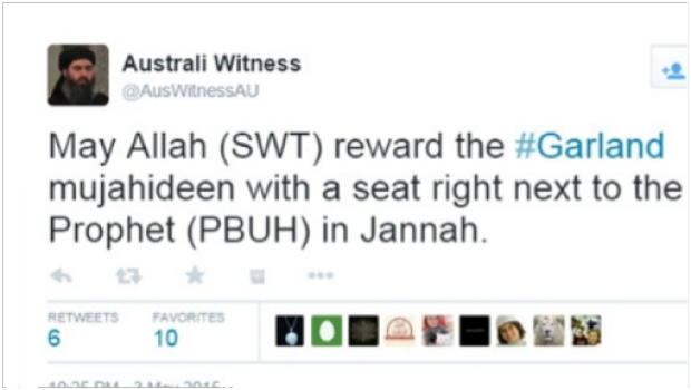 Các nhà chức trách Mỹ đã theo dõi tài khoản Twitter có tên 'AustraliWitness' của Joshua Goldberg sau khi tài khoản này đã kêu gọi tấn công khủng bố ở Texas sau khi một số người ở bang này tổ chức hoạt động bắn vào bia đạn có hình đấng tối cao của IS - Muhammad. Hai kẻ có trang bị vũ trang đã bị cảnh sát hạ gục ngay tại hiện trường vào tháng 5 năm nay. Vào ngày 9 tháng 6, tài khoản AustraliWitness đã ca ngợi cuộc tấn công này và nói hắn là người tị nạn Li Băng ủng hộ IS và hiện cư ngụ ở thủ phủ nước Úc. Hắn nói hắn đã đã thuyết phục các chiến binh Hồi Giáo tấn công các hội trường ở thành phố Los Angeles (Mỹ) và Melbourne (Úc).