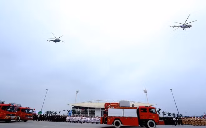 3 trực thăng của Trung đoàn Không quân 916, trực thuộc Sư đoàn 371 Quân chủng Phòng không không quân tuần tiễu 2 vòng trước quảng trường sân vận động quốc gia Mỹ Đình.