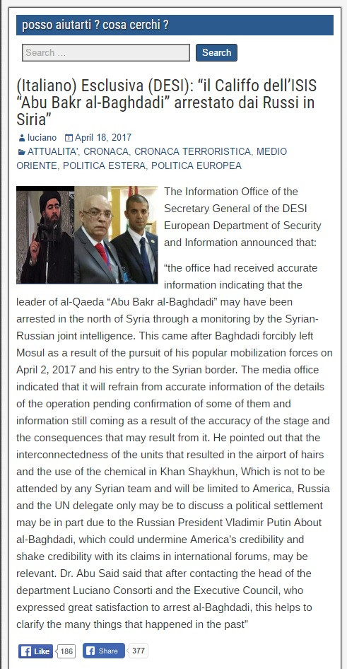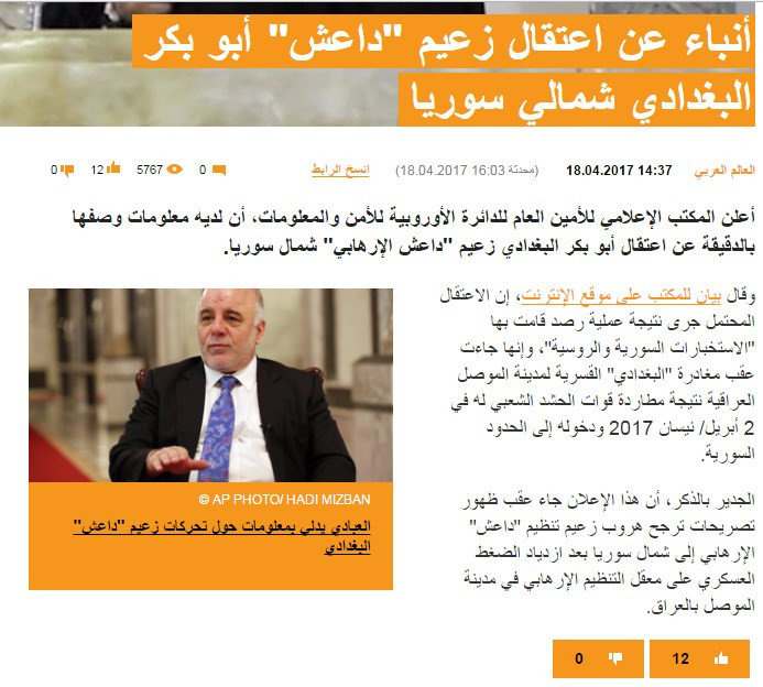 "Văn phòng nhận được thông tin chính xác cho biết: lãnh tụ tinh thần tối cao của al-Qaeda" Abu Bakr al-Baghdadi" có thể đã bị bắt trên vùng lãnh thổ phía bắc Syria nhờ sự theo dõi của liên minh tình báo Syria-Nga. Sự kiện này xảy ra sau khi Baghdadi buộc phải rời bỏ khỏi Mosul trong một nỗ lực của lực lượng chiến binh IS ngày 02.04. 2017 và bí mật vượt biên giới Syria.