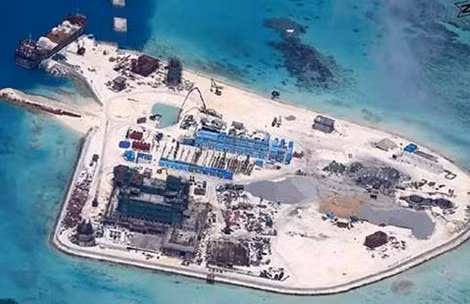 Các đảo nhân tạo Trung Quốc xây ở các bãi đá chiếm của Việt Nam tại Trường Sa nhằm mục đích áp đặt việc thực thi cái gọi là đường lưỡi bò để chiếm trọn biển Đông. Trongảnh: LàĐá Chữ Thậpcủa Việt Nam bị Trung Quốc chiếm và cải tạo đất, xây thành đảo nhân tạo. Ảnh: CSIS/IHS Jane’s