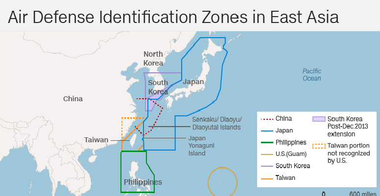 Việc tuyên bố ADIZ yêu cầu các máy bay phải thông báo cho nhà chức trách Trung Quốc trước khi bay qua. Mỹ và Nhật Bản không thừa nhận yêu sách của Trung Quốc tại vùng này.
