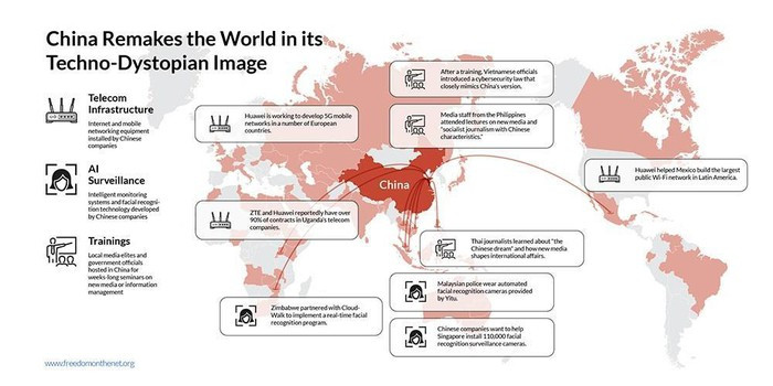 Freedom House đã phân tích tự do Internet ở 65 quốc gia trên toàn cầu từ tháng 6/2017 đến tháng 5/2018. Báo cáo cho thấy các công ty công nghệ Trung Quốc đang trang bị cho nhiều quốc gia khác cơ sở hạ tầng viễn thông, giám sát AI và đào tạo kiểm duyệt tương tự như ở đại lục.