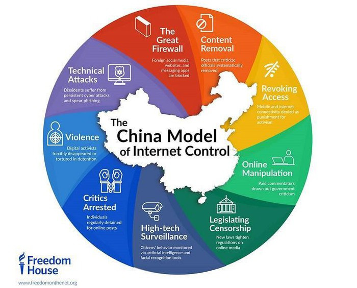 Bản thân Trung Quốc đang sở hữu hệ thống tường lửa ngăn chặn nhiều ứng dụng và website. Nước này giám sát người dân bằng công nghệ nhận dạng gương mặt, đẩy mạnh cuộc chiến tranh ngầm về AI và đưa ra các đạo luật kiểm soát Internet như Luật an ninh mạng 2018.