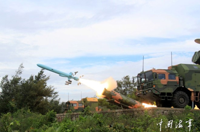 Hôm 20/3, một nhà phân tích quân sự Trung Quốc đăng bức ảnh trên trang mạng Weibo, thể hiện cảnh lực lượng nước này phóng tên lửa chống hạm YJ-62 cùng mái vòm radar bố trí xung quanh.