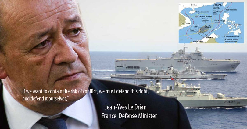 Pháp với dự kiến can thiệp vào cuộc tranh chấp giữa Trung Quốc và các nước Đông Nam Á, đóng vai trò tương tự như Nhật Bản và Mỹ. Trong đó hai quốc gia này đang cố gắng thể hiện là quốc gia hàng đầu dẫn dắt một liên minh chống Trung Quốc trong khu vực. Chính phủ Pháp cho rằng, hải quân châu Âu nên thường xuyên có sự hiện diện trên vùng nước Biển Đông và tham gia vào sứ mệnh đảm bảo tự do hàng hải trong khu vực.