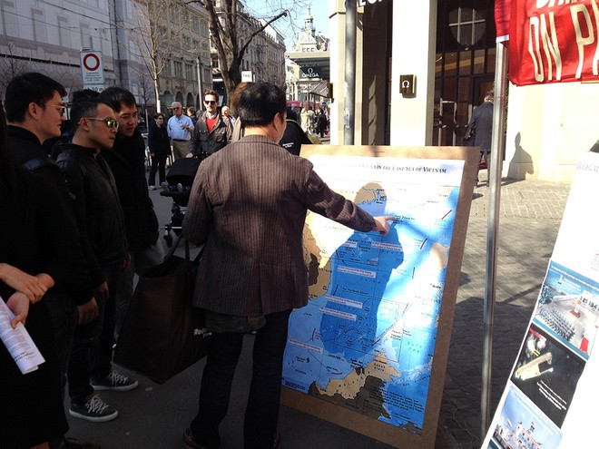 Tại cuộc triển lãm do cộng đồng người Việt Nam tổ chức tại Thụy Sĩ, một nhóm du khách Hong Kong trao đổi trước tấm bản đồ Biển Đông ghi chú các sự kiện đã và đang diễn ra tại đây. Trên tấm bản đồ này, hành động xâm chiếm của Trung Quốc đối với các quần đảo Hoàng Sa, Trường Sa năm 1974 và 1988, gây ra cái chết của nhiều chiến sĩ Việt Nam được liệt kê rõ ràng.