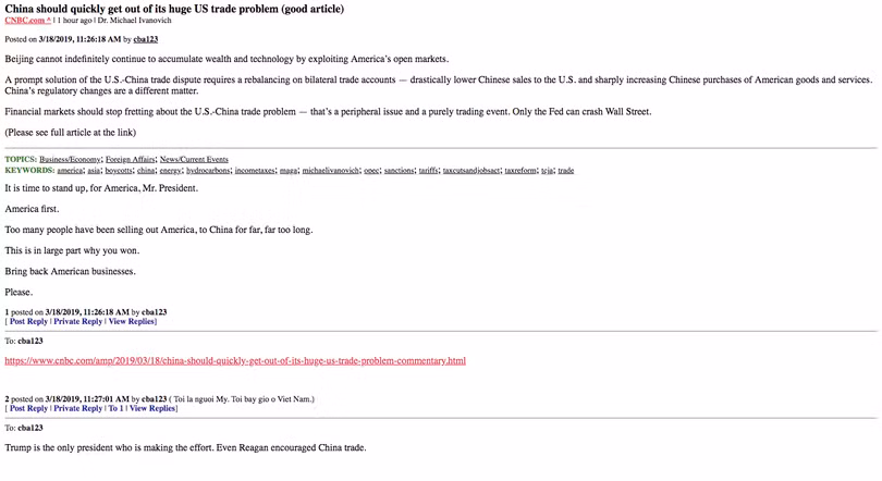 Bên dưới bài báo nói về thặng dư thương mại của Trung Quốc so với Mỹ của CNBC, không ít người bình luận đã tỏ thái độ ủng hộ ông Trump trong cuộc chiến thương mại với Trung Quốc.