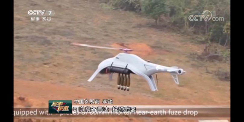 Trực thăng không người lái mang đạn cối Trung Quốc. Ảnh: video quảng bá sản phẩm CCTV 7.