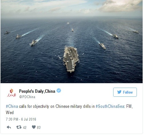 Ngày 05/07/2016, các phương tiện truyền thông Trung Quốc cho biết Bắc Kinh sẵn sàng "đối đầu quân sự" với Mỹ trong khu vực.