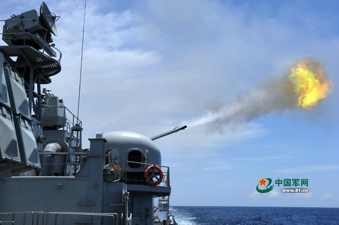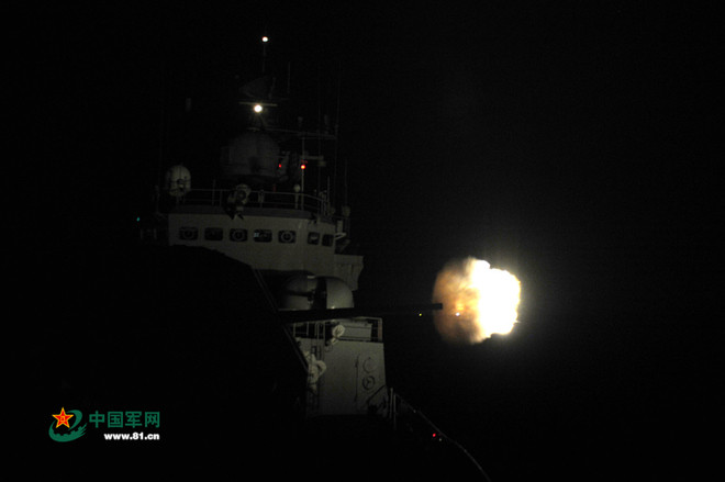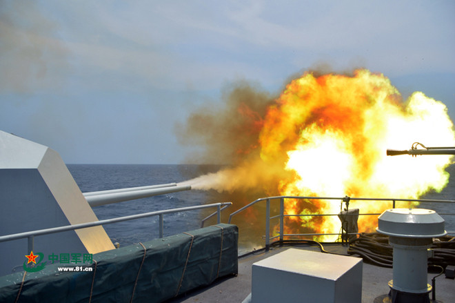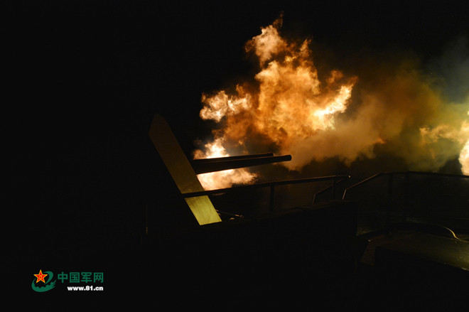 Ban ngày, Trung Quốc diễn tập phòng thủ bờ biển. Trong ảnh là hỏa pháo bắn ra từ hệ thống pháo chủ lực trên tàu chiến Trung Quốc.
