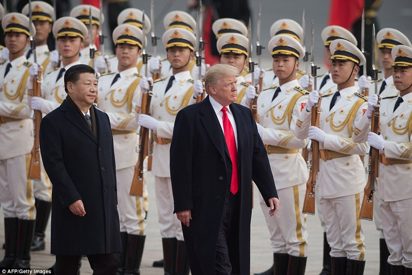 Chủ tịch Trung Quốc, Tập Cận Bình cùng ông Trump bước trên thảm đỏ tại đại lễ đường nhân dân Bắc Kinh, Trung Quốc.