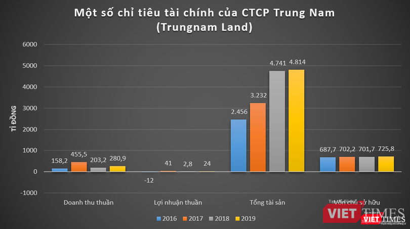 Dữ liệu của VietTimes cho thấy, trong 4 năm trở lại đây, doanh thu riêng lẻ của Trungnam Group luôn đạt hàng nghìn tỉ đồng. Đáng chú ý, năm 2019, doanh thu thuần của Trungnam Group đạt 6.480 tỉ đồng, cao gấp hơn 7 lần so với năm 2018; lãi thuần cũng tăng gấp 5,7 lần lên mức 123,8 tỉ đồng.