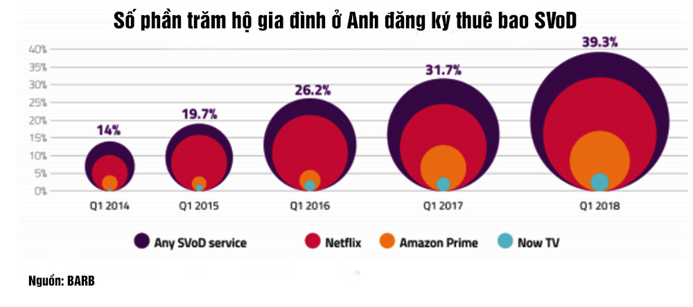 Ở Anh, vào tháng 7 năm 2017, cơ quan truyền thông Ofcom đã đưa ra một thống kê cho thấy lần đầu tiên số lượng thuê bao đăng ký dịch vụ video theo yêu cầu (SvoD) vượt qua số thuê bao truyền hình trả tiền. Cụ thể, trong quý I năm 2017, đã có 15,4 triệu lượt đăng ký dịch vụ SVoD của Netflix, Amazon Prime Video và Now TV, trong khi con số này ở truyền hình trả tiền truyền thống là 15,1 triệu lượt. Nhìn chung, 11,1 triệu hộ gia đình ở Anh có ít nhất một thuê bao của một trong ba hãng nói trên.