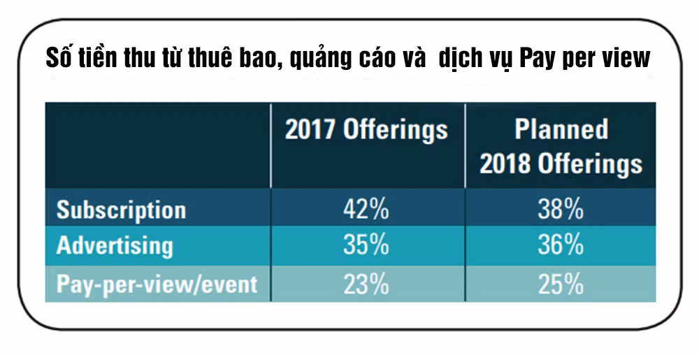 Số tiền quảng cáo đổ vào truyền hình OTT cũng đang tăng lên. Xu hướng này cho thấy các nhà quảng cáo đã coi OTT là một phương thức marketing hiệu quả. Biểu đồ dưới đây do Unisphere Research, Level 3 và Streaming Media đưa ra cho thấy nếu như năm 2017 số tiền mà các hãng OTT thu được từ thuê bao là 42%, quảng cáo là 35% thì dự kiến năm 2018 số tiền thu được từ quảng cáo tăng lên 36%. Số tiền thu được từ dịch vụ Pay-per-View (tạm dịch là Xem gì trả nấy) cũng tăng từ 23% lên 25%.