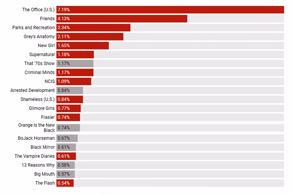 Biểu đồ dưới đây là những chương trình có số lượng người xem cao nhất trên Netflix tính từ tháng 1/2018 – 11/2018, trong đó các cột màu xám là chương trình do Netflix tự sản xuất, cột màu đỏ là chương trình Netflix mua lại bản quyền từ Disney, Fox, WarnerMedia và NBCU (nguồn: Recode)