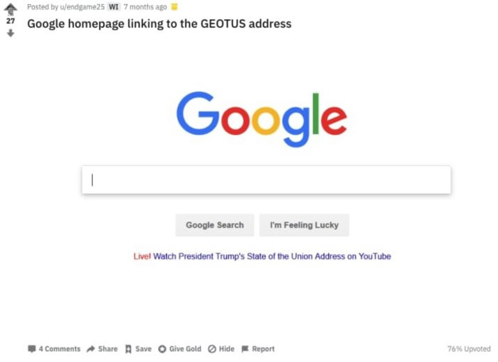 CNBC xác nhận các ảnh chụp màn hình Google trong video là chính xác. Không rõ video do chính quyền TT Trump tạo ra hay do bên thứ ba và được TT Trump chia sẻ lại. Tuy nhiên, Google phản hồi lại rằng họ cũng quảng bá bài phát biểu của TT Trump trên trang chủ năm 2018. Năm 2017, video không có mặt trên trang chủ do ông Trump chỉ đưa ra tuyên bố trước Quốc hội mà không phải Thông điệp liên bang.