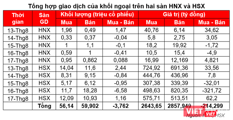 Trên 2 sàn HNX và HSX, giá trị giao dịch ròng của nhà đầu tư nước ngoài giảm mạnh và có diễn biến trái chiều nhau. Ở trên sàn HNX, nhà đầu tư nước ngoài mua ròng hơn 1 triệu cổ phiếu, giá trị giao dịch ròng đạt 35,85 tỷ đồng. Trong khi đó, nhà đầu tư nước ngoài bán ròng 4,77 triệu cổ phiếu, tương đương với giá trị bán ròng đạt 214,3 tỷ đồng.
